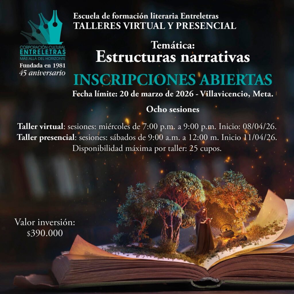 En su 45 aniversario, la Corporación Cultural Entreletras por medio de su Escuela de formación literaria, ofrece el presente taller en las modalidades virtual y presencial, según los términos descritos en la convocatoria.